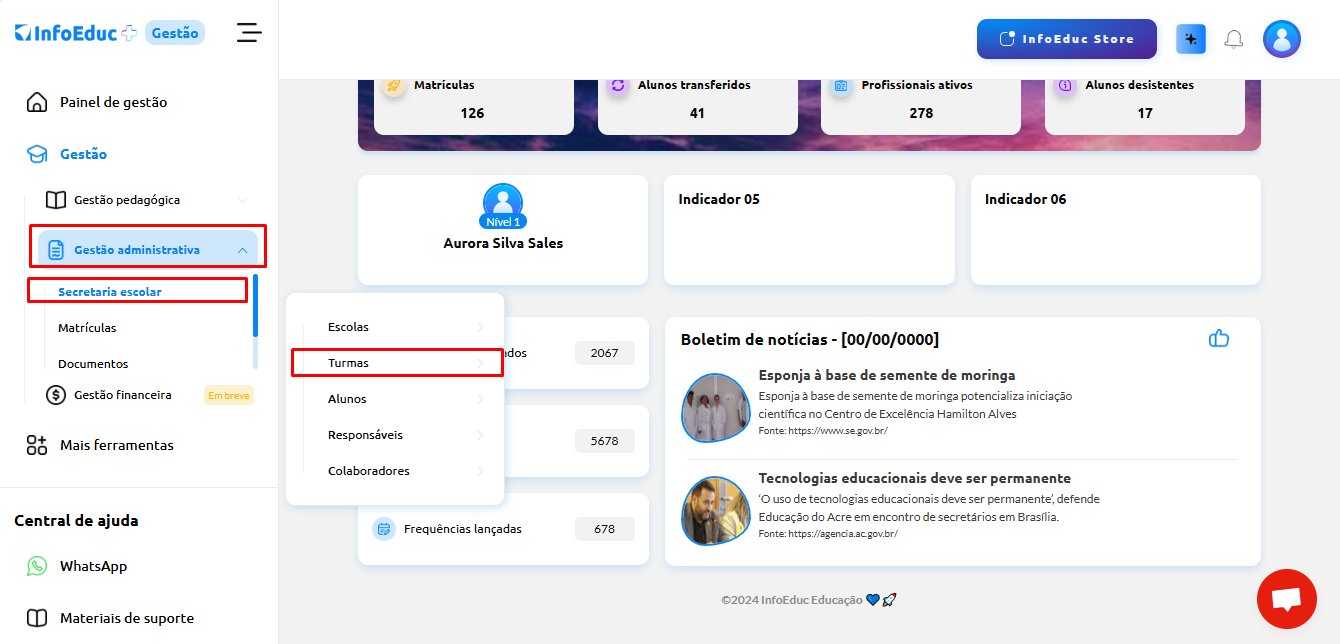 Primeiro passo: Assim que acessar a plataforma da InfoEduc, vá até a opção 'Gestão Administrativa' e clique nela. Em seguida, selecione a opção 'Secretaria Escolar' e, por fim, clique em 'Turmas'.